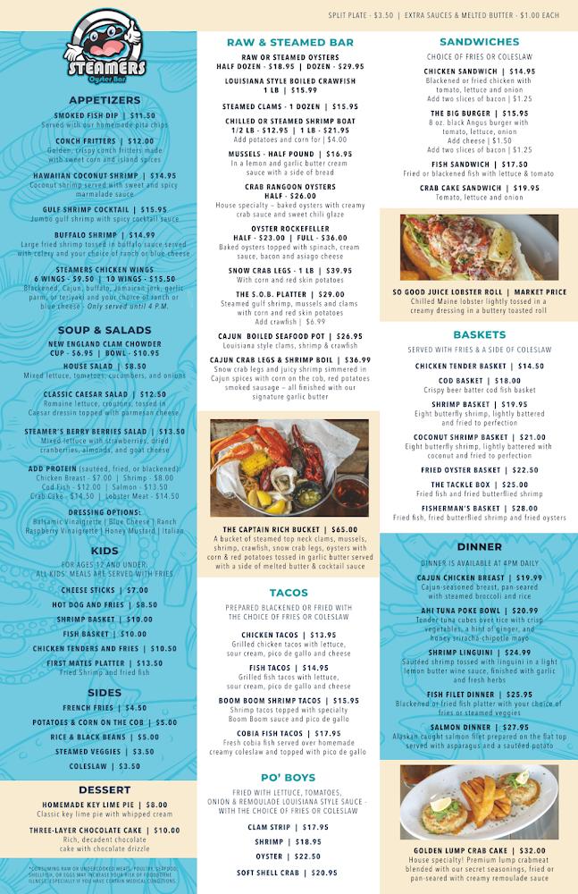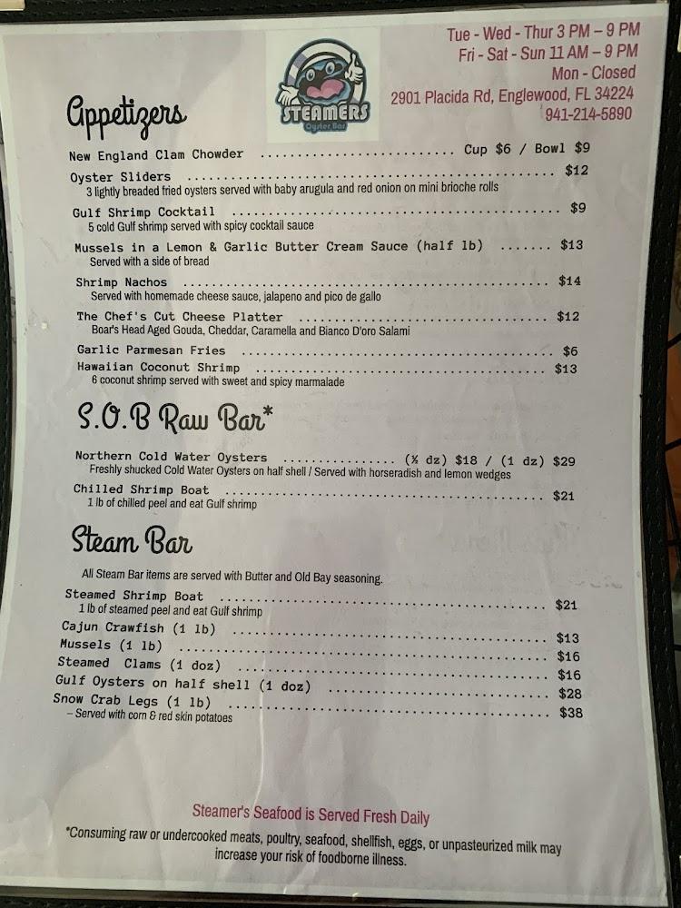 Steamers Oyster Bar occupies a prime spot on Placida Rd, making it a convenient stop for seafood enthusiasts in Englewood. The restaurant's vibrant exterior and inviting patio immediately catch the eye. Parking is hassle-free, with plenty of free street parking available. Inside, the cozy ambiance pairs well with the restaurant's fast-paced service. The space is wheelchair accessible, ensuring everyone can enjoy the delicious offerings. Open every day of the week, it welcomes guests for lunch, dinner, and even dessert, catering to families with a dedicated kids' menu. The atmosphere fosters a sense of community, welcoming both regulars and out-of-towners with equal cheer. Notable for its commitment to sustainability, Steamers prioritizes locally sourced seafood, delighting customers not just with exquisite food but also with a responsible dining experience. A friendly group of staff members adds to the welcoming vibe, making diners feel right at home.